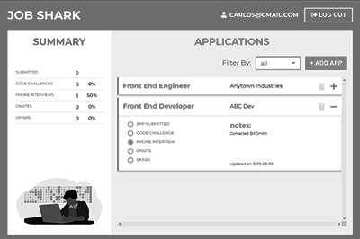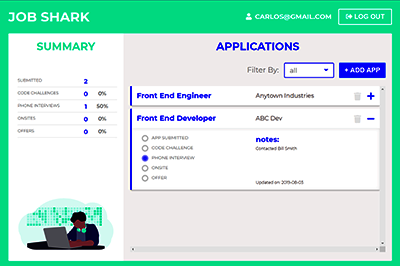 I worked with a team of devs through the Chingu Cohort to create a job application tracking app. The app allows a user to register and login, and add/delete job application entries.