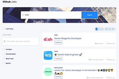 This is a React Front End that queries the Github Jobs API for job searching. Built with React, and uses a Redux-like store built using React Hooks (Context) as well as a custom connect HOC.
